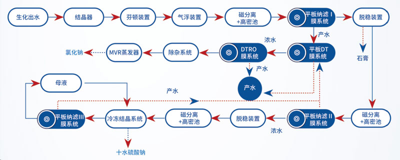該工藝鏈包括磁絮凝預(yù)處理、高密池預(yù)處理、DTRO、平板納濾、脫穩(wěn)等系統(tǒng)。實(shí)踐證明,基于DTRO為核心技術(shù)的煤化工廢水處理工藝具有顯著的技術(shù)優(yōu)勢,可以最大程度高倍濃縮,減少蒸發(fā)處理量,進(jìn)而降低蒸發(fā)投資成本和整體運(yùn)行成本,實(shí)現(xiàn)鹽的分離再生。同時(shí),DTRO具有抗污堵、耐高壓等優(yōu)勢,能夠保障設(shè)備長時(shí)間高效運(yùn)行,真正實(shí)現(xiàn)煤化工廢水低成本零排放處理。